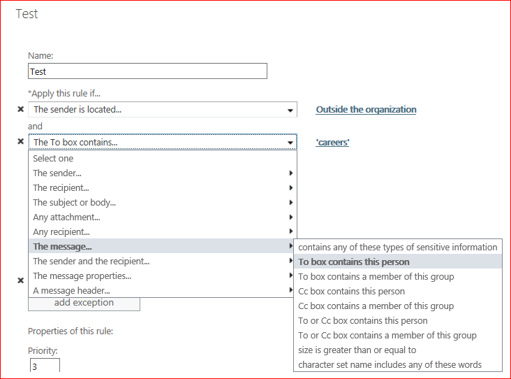 Regarding IT Projects for Exchange Server, a transport rule can apply actions to messages based on the recipient address. If you however attempt to use a Distribution List (group) the rule will not save, giving you the following error message:
