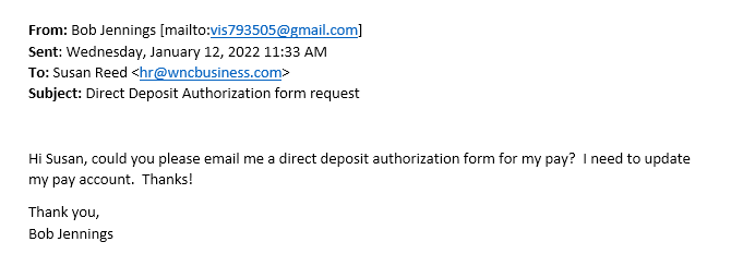 The attacker's signature and email name indicate the message is from the employee Bob Jennings, but that Gmail account is not Bob's email! Unfortunately this one worked and the hacker was sent funds intended for the real Bob. ☹