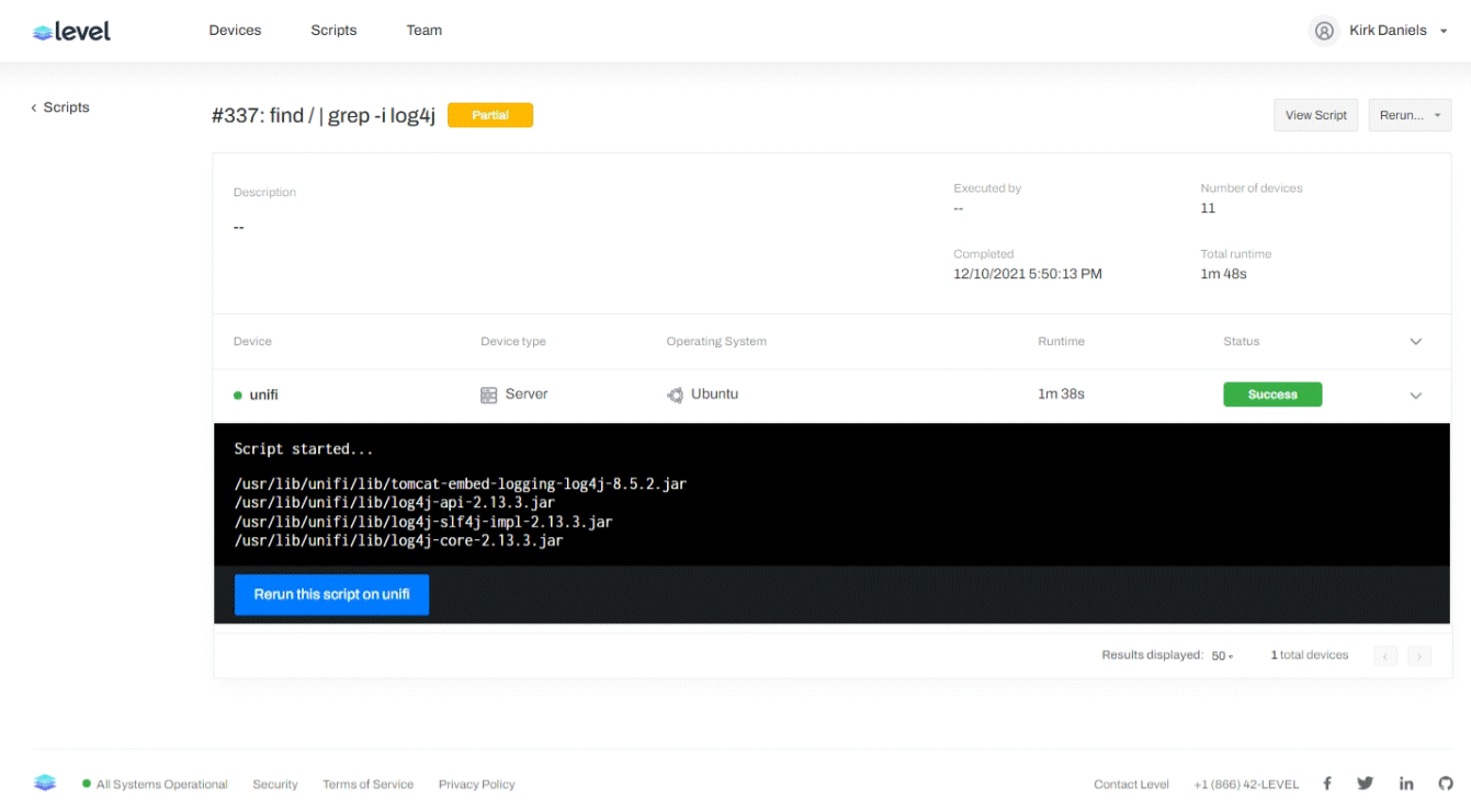 On Friday, before lists of effected products were aggregated, we used our remote management tool Level to scan our client machines for any trace of the Log4j tool. We discovered early on some products were using the Log4j tool and were vulnerable.