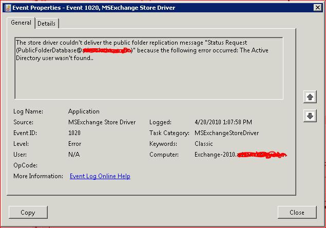 Event ID: 1020, Source: MSExchange Store Driver. The store driver couldn't deliver the public folder replication message "Status Request (PublicFolderDatabase@yourdomain.com)" because the following error occurred: The Active Directory user wasn't found.