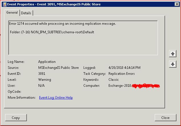 Event ID: 3091, Source: MSExchangeIS Public Store. Error 1274 occurred while processing an incoming replication message.