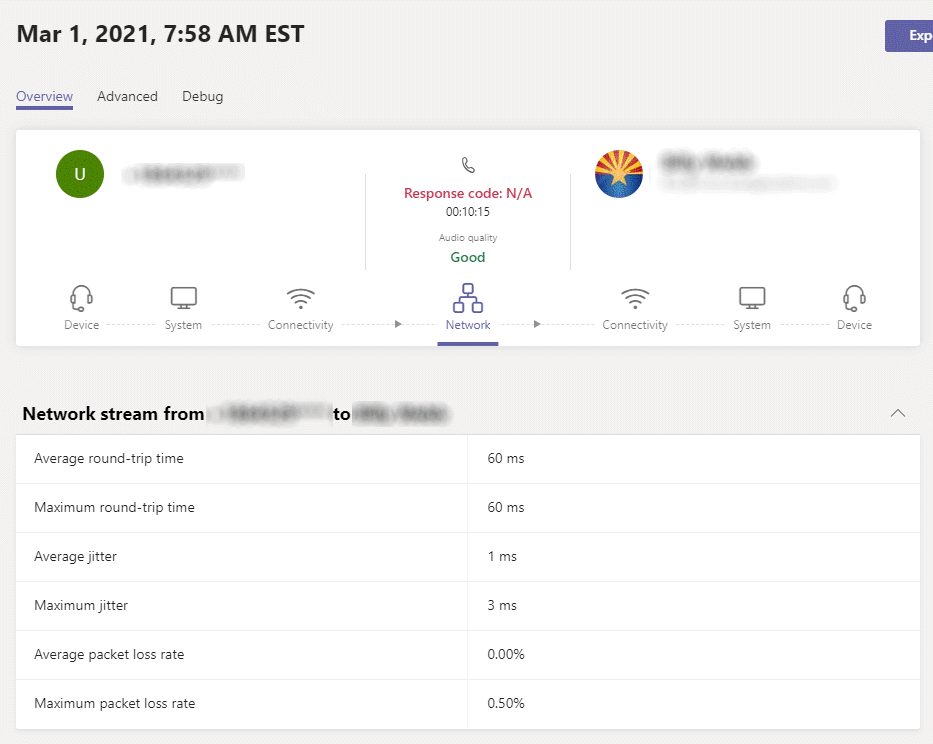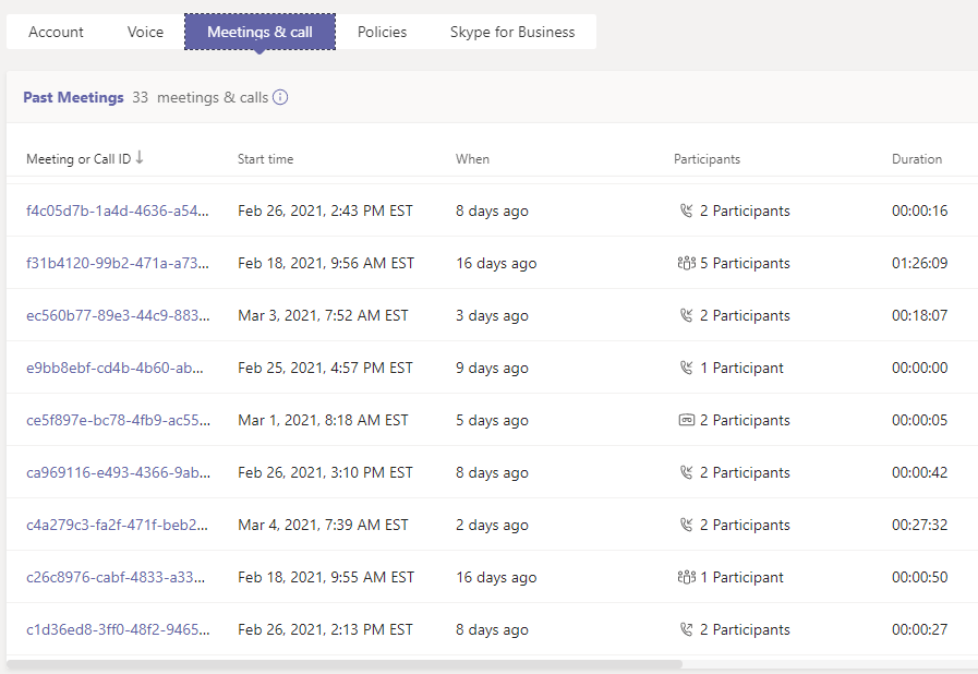 As an admin of the system, there isn't a way to see at glance all the active calls or who is on the phone. Teams shortcomings in real-time data however are overcome by it's post-call details. An individual users' call history can be found under their respective Meetings &Call tab. If you drill into each call there are excellent details and quality metrics that will assist an admin in determining the cause of any poor call quality that might occur.