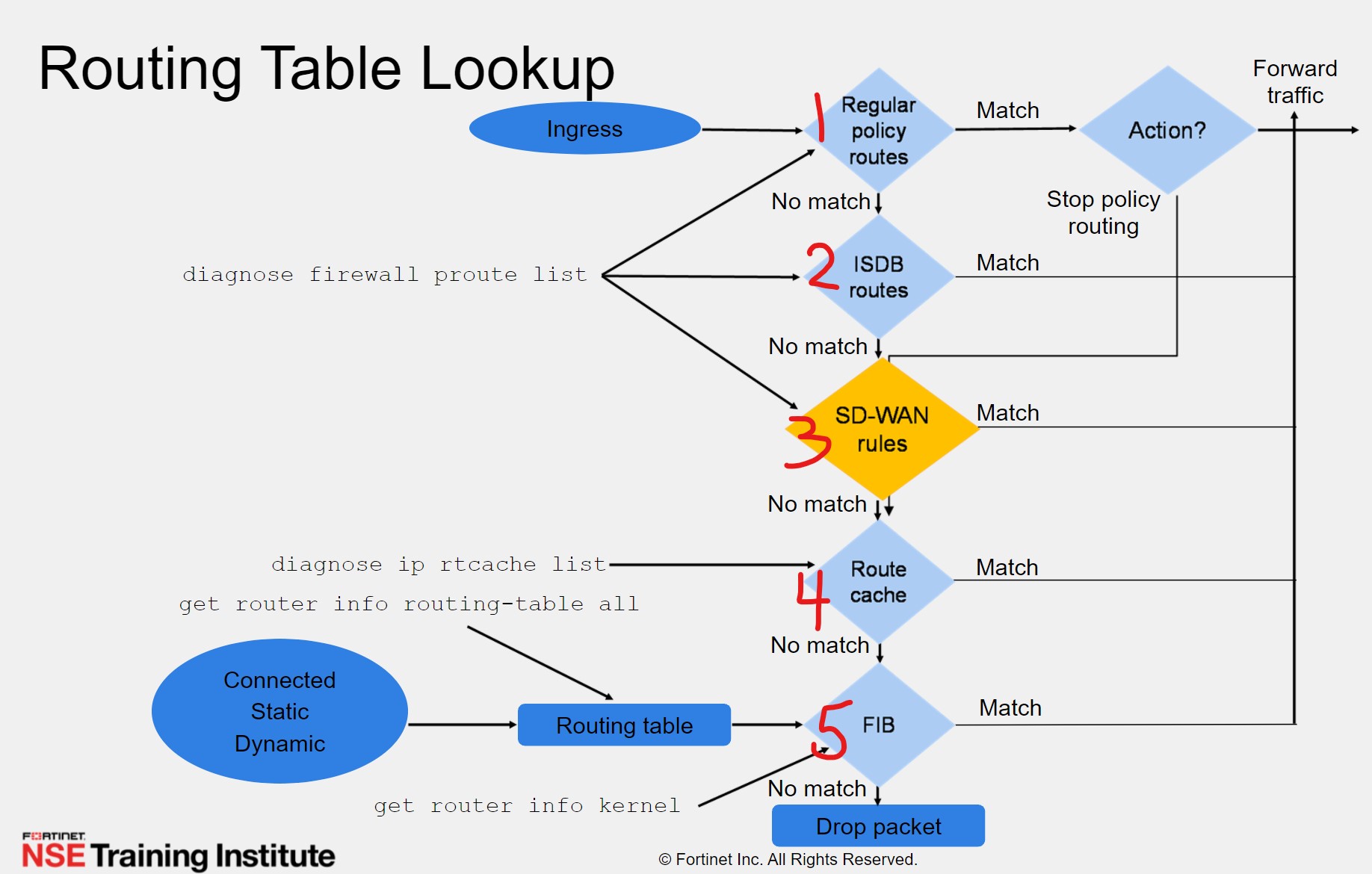 - SD-WAN rules function as policy routes. This makes total sense now, but until it was stated I didn't make the connection. Normal policy routes will take precedence over SD-WAN rules. SD-WAN rules override the route table (≈FIB). See image below: